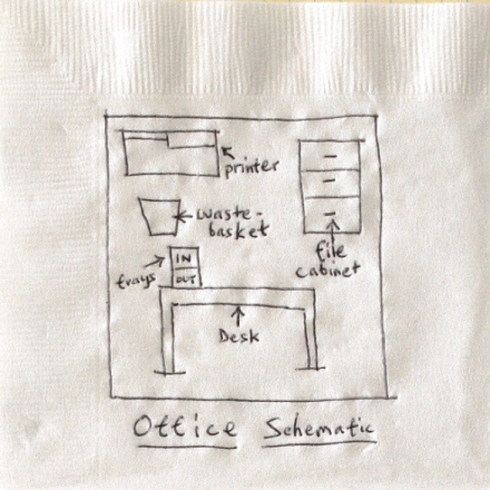 office-schematic Ίσως το πιο διάσημο πρωτότυπο χαμηλής πιστότητας να είναι το σχεδιάγραμμα της γραφικής επιφάνειας εργασίας που έγινε σε μια χαρτοπετσέτα από τους ερευνητές του Xerox PARC και χρησιμοποιούσε τη μεταφορά του γραφείου για την απεικόνιση των διεπαφών. Previous Next